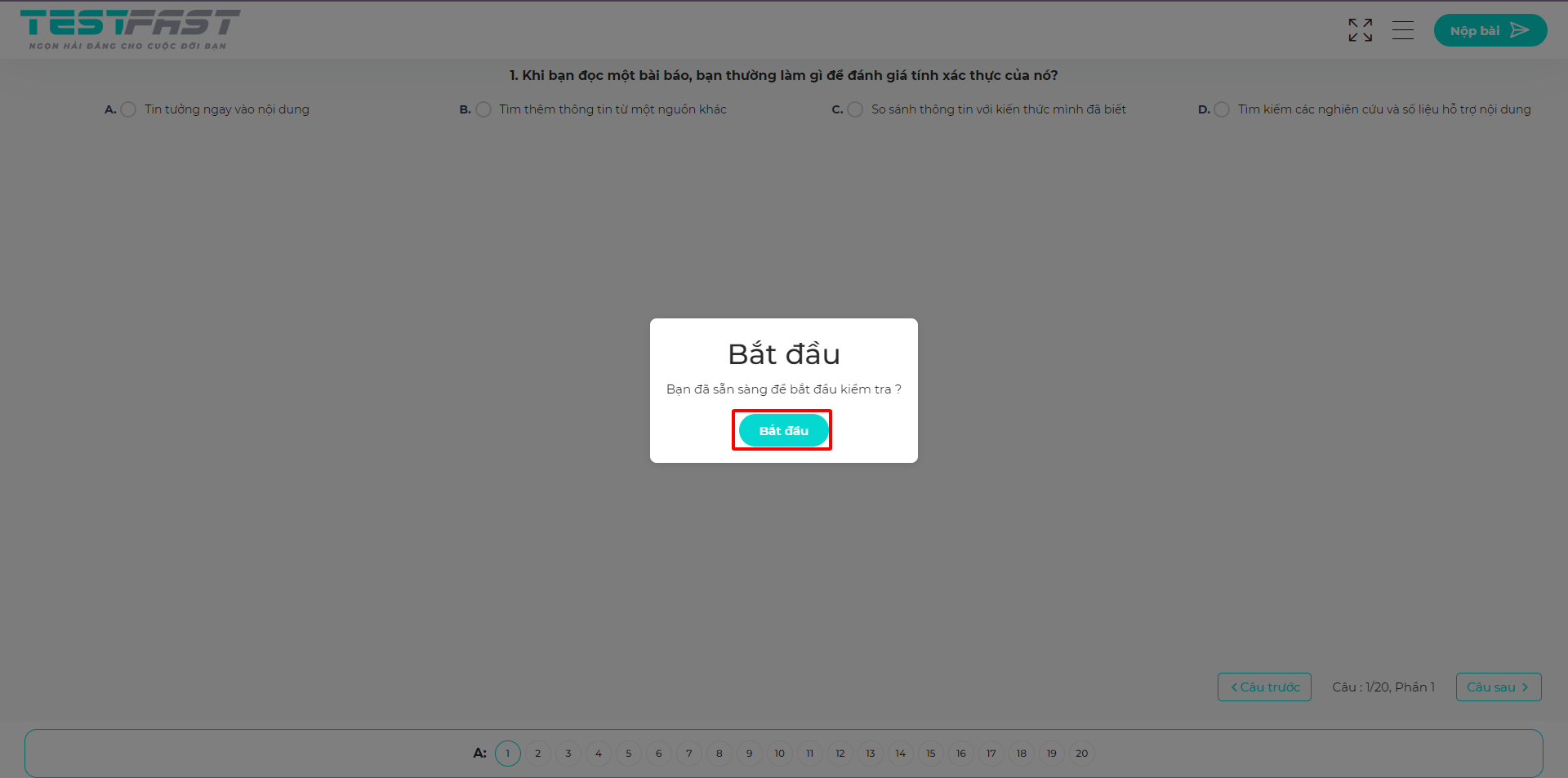 Bước 2: Nhấn vào “Bắt đầu” và thực hiện bài test. Nội dung bài test đã được tinh gọn và tiết kiệm thời gian của bạn.